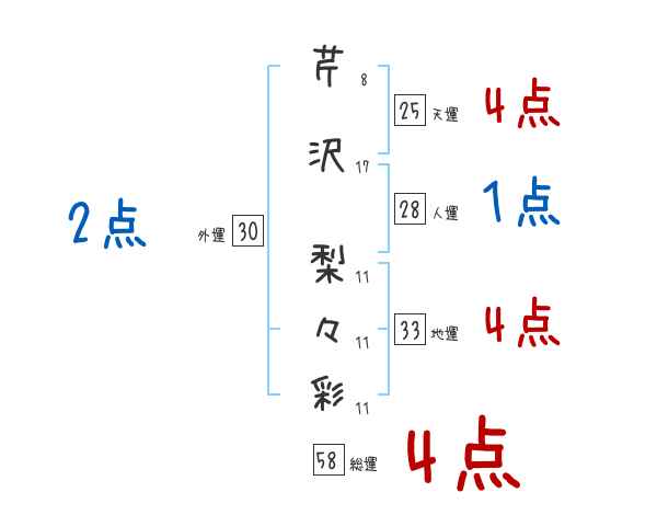 外運![]() | 芹沢梨々彩さんの外運は30画の2つ星!浮き沈みの激しさに注意しましょう。 生活面を象徴する運勢です。外部から受ける影響力を表し、結婚運、家庭運や職場、環境への順応性を表します。 |