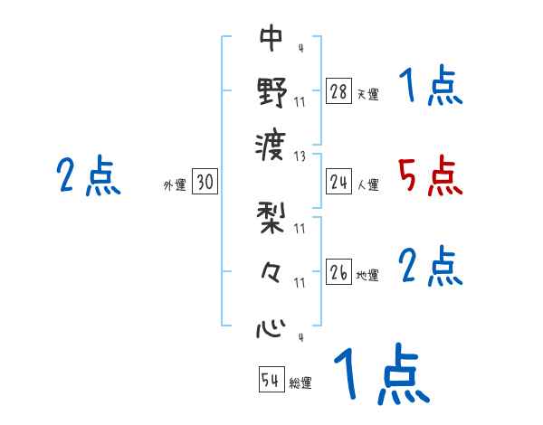 総運![]() | 中野渡梨々心さんの総運は54画の1つ星!トラブルが多いかも。周りをよく見て協調して過ごしましょう。 あなたの人生を表す1番重要な運勢です。生涯を通じて影響する総合運となり、主に50歳以降の晩年期に影響を及ぼします。 |