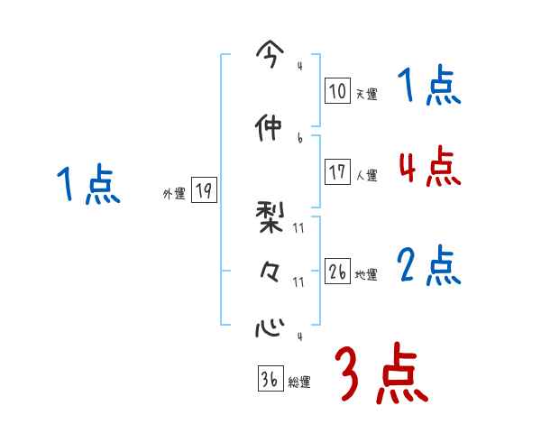 総運![]() | 今仲梨々心さんの総運は36画の3つ星!先見性が豊かです。多少神経質で苦労することも。 あなたの人生を表す1番重要な運勢です。生涯を通じて影響する総合運となり、主に50歳以降の晩年期に影響を及ぼします。 |
