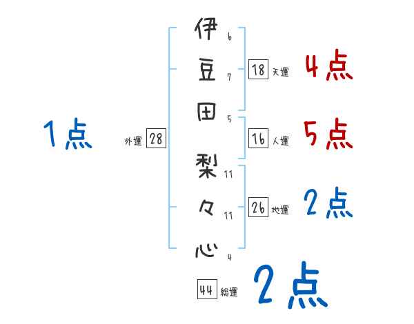 総運![]() | 伊豆田梨々心さんの総運は44画の2つ星!誠実で慎重な性格。物事を考えすぎないように注意しましょう。 あなたの人生を表す1番重要な運勢です。生涯を通じて影響する総合運となり、主に50歳以降の晩年期に影響を及ぼします。 |