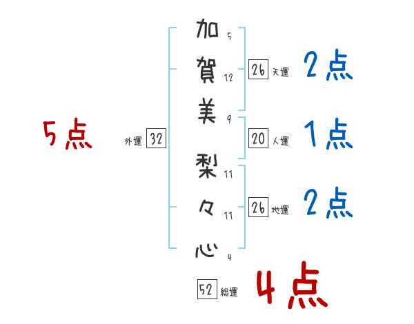 外運![]() | 加賀美梨々心さんの外運は32画の5つ星!柔軟性があり成功する。チャンスが多く金運が良い。 生活面を象徴する運勢です。外部から受ける影響力を表し、結婚運、家庭運や職場、環境への順応性を表します。 |