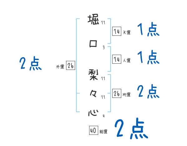 外運![]() | 堀口梨々心さんの外運は26画の2つ星!波瀾万丈かも。信頼できる人を大事にしましょう。 生活面を象徴する運勢です。外部から受ける影響力を表し、結婚運、家庭運や職場、環境への順応性を表します。 |