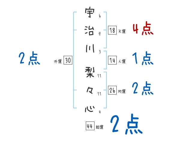 総運![]() | 宇治川梨々心さんの総運は44画の2つ星!誠実で慎重な性格。物事を考えすぎないように注意しましょう。 あなたの人生を表す1番重要な運勢です。生涯を通じて影響する総合運となり、主に50歳以降の晩年期に影響を及ぼします。 |