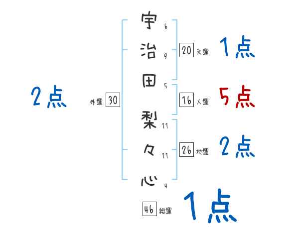 地運![]() | 宇治田梨々心さんの地運は26画の2つ星!波瀾万丈かも。信頼できる人を大事にしましょう。 個性を表す基礎的な運勢です。性格形成や対人関係、行動力など家庭環境に影響されます。主に誕生してから20歳くらいまでの若年期の運勢を表します。 |