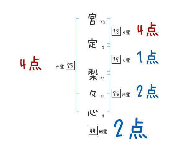 総運![]() | 宮定梨々心さんの総運は44画の2つ星!誠実で慎重な性格。物事を考えすぎないように注意しましょう。 あなたの人生を表す1番重要な運勢です。生涯を通じて影響する総合運となり、主に50歳以降の晩年期に影響を及ぼします。 |