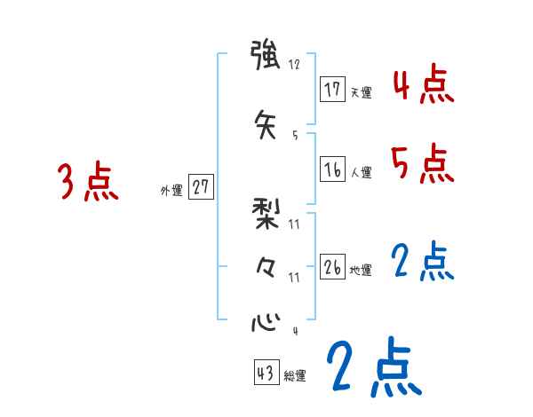 外運![]() | 強矢梨々心さんの外運は27画の3つ星!頭脳明晰だが強情で摩擦が多い傾向。孤立に注意。 生活面を象徴する運勢です。外部から受ける影響力を表し、結婚運、家庭運や職場、環境への順応性を表します。 |