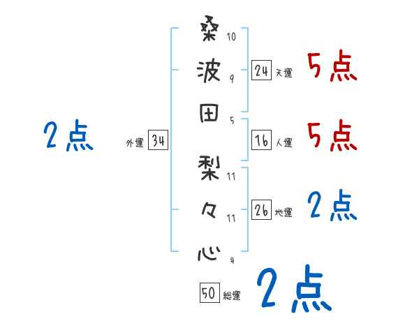 人運![]() | 桑波田梨々心さんの人運は16画の5つ星!人望が厚く大きく発展する。逆転成功が見える。 性格や才能などを表す2番目に重要な運勢です。人間関係や協調性、社会的な成功に影響します。主に20歳から50歳ぐらいまでの中年期の運勢を表します。 |