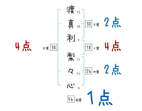 天運![]() | 渡真利梨々心さんの天運は30画の2つ星!浮き沈みの激しさに注意しましょう。 家系が持つ宿命的な運勢を表します。祖先から受け継いだ苗字ですので自分の力が及びません。家柄を象徴します。 |
