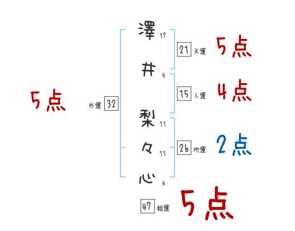総運![]() | 澤井梨々心さんの総運は47画の5つ星!実力が開花し発展する円満な人生。財に恵まれる。 あなたの人生を表す1番重要な運勢です。生涯を通じて影響する総合運となり、主に50歳以降の晩年期に影響を及ぼします。 |