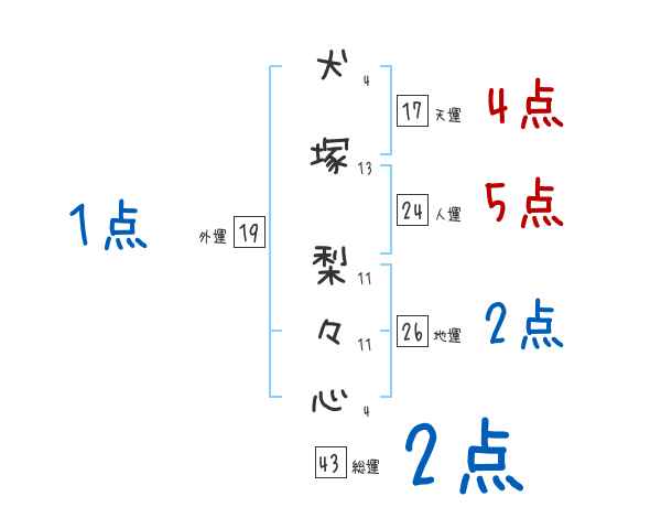 外運![]() | 犬塚梨々心さんの外運は19画の1つ星!優れた才能を持ちますが、協調性が足りないことも。周りの人と協力する事を意識しましょう。 生活面を象徴する運勢です。外部から受ける影響力を表し、結婚運、家庭運や職場、環境への順応性を表します。 |