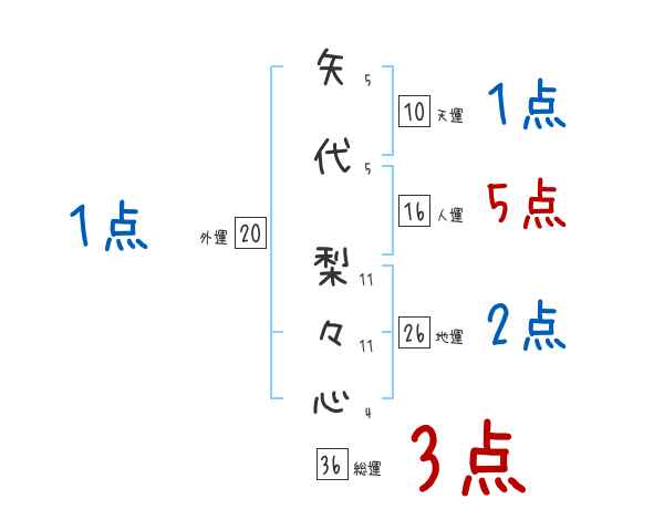総運![]() | 矢代梨々心さんの総運は36画の3つ星!先見性が豊かです。多少神経質で苦労することも。 あなたの人生を表す1番重要な運勢です。生涯を通じて影響する総合運となり、主に50歳以降の晩年期に影響を及ぼします。 |