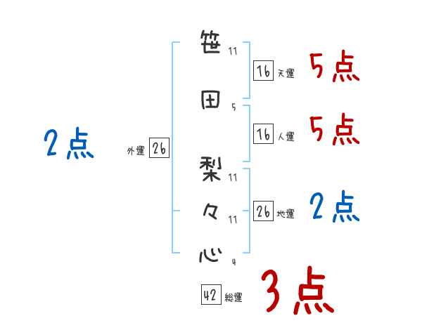 外運![]() | 笹田梨々心さんの外運は26画の2つ星!波瀾万丈かも。信頼できる人を大事にしましょう。 生活面を象徴する運勢です。外部から受ける影響力を表し、結婚運、家庭運や職場、環境への順応性を表します。 |