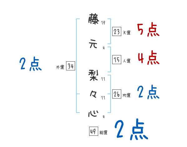 天運![]() | 藤元梨々心さんの天運は23画の5つ星!想像力に優れ活力がある。一代で成功し名誉を手に入れる。 家系が持つ宿命的な運勢を表します。祖先から受け継いだ苗字ですので自分の力が及びません。家柄を象徴します。 |