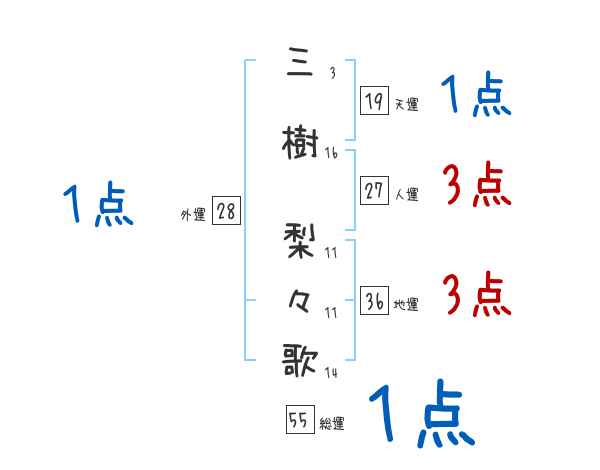 外運![]() | 三樹梨々歌さんの外運は28画の1つ星!家庭環境に注意。スポーツで活躍できる能力があるかも。 生活面を象徴する運勢です。外部から受ける影響力を表し、結婚運、家庭運や職場、環境への順応性を表します。 |