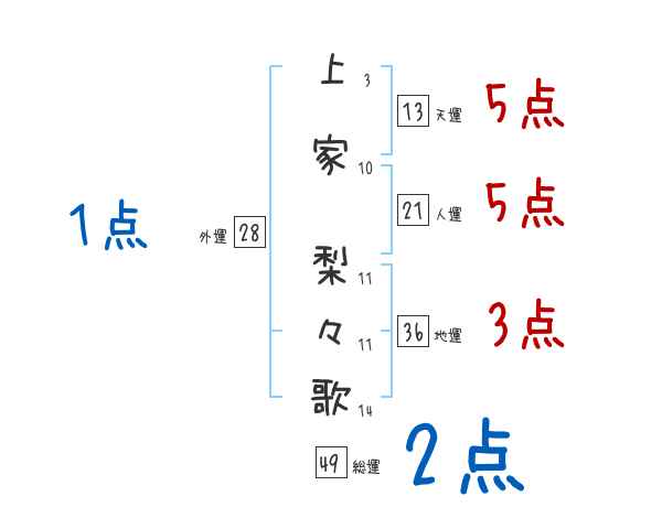外運![]() | 上家梨々歌さんの外運は28画の1つ星!家庭環境に注意。スポーツで活躍できる能力があるかも。 生活面を象徴する運勢です。外部から受ける影響力を表し、結婚運、家庭運や職場、環境への順応性を表します。 |