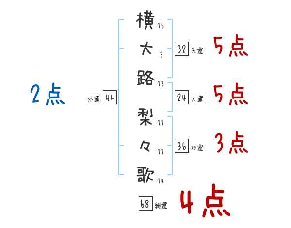 天運![]() | 横大路梨々歌さんの天運は32画の5つ星!柔軟性があり成功する。チャンスが多く金運が良い。 家系が持つ宿命的な運勢を表します。祖先から受け継いだ苗字ですので自分の力が及びません。家柄を象徴します。 |