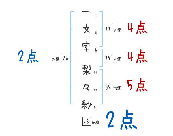天運![]() | 一文字梨々紗さんの天運は11画の4つ星!着実に富や地位を得る幸運な人生。 家系が持つ宿命的な運勢を表します。祖先から受け継いだ苗字ですので自分の力が及びません。家柄を象徴します。 |