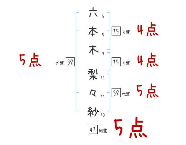 総運![]() | 六本木梨々紗さんの総運は47画の5つ星!実力が開花し発展する円満な人生。財に恵まれる。 あなたの人生を表す1番重要な運勢です。生涯を通じて影響する総合運となり、主に50歳以降の晩年期に影響を及ぼします。 |