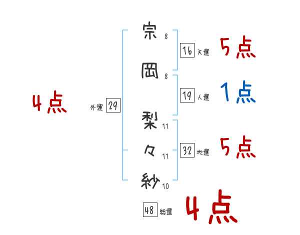 外運![]() | 宗岡梨々紗さんの外運は29画の4つ星!完全主義で才能がある。厳格な心の持ち主。 生活面を象徴する運勢です。外部から受ける影響力を表し、結婚運、家庭運や職場、環境への順応性を表します。 |