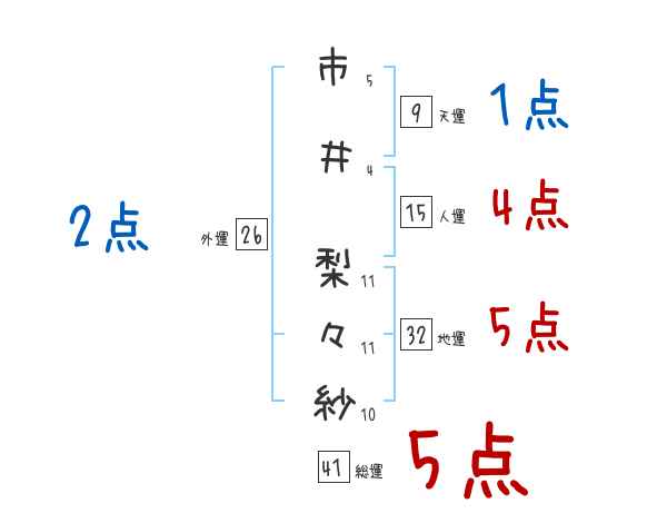 外運![]() | 市井梨々紗さんの外運は26画の2つ星!波瀾万丈かも。信頼できる人を大事にしましょう。 生活面を象徴する運勢です。外部から受ける影響力を表し、結婚運、家庭運や職場、環境への順応性を表します。 |