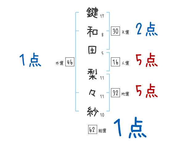 天運![]() | 鍵和田梨々紗さんの天運は30画の2つ星!浮き沈みの激しさに注意しましょう。 家系が持つ宿命的な運勢を表します。祖先から受け継いだ苗字ですので自分の力が及びません。家柄を象徴します。 |