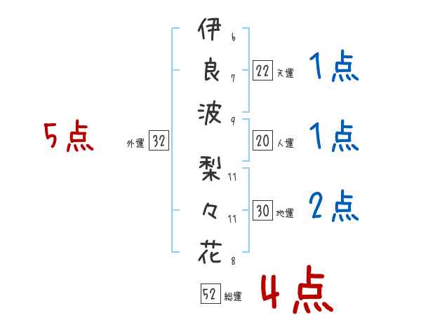外運![]() | 伊良波梨々花さんの外運は32画の5つ星!柔軟性があり成功する。チャンスが多く金運が良い。 生活面を象徴する運勢です。外部から受ける影響力を表し、結婚運、家庭運や職場、環境への順応性を表します。 |