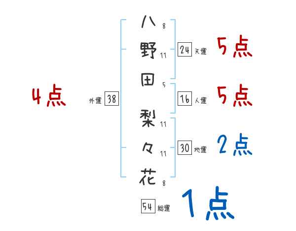 人運![]() | 八野田梨々花さんの人運は16画の5つ星!人望が厚く大きく発展する。逆転成功が見える。 性格や才能などを表す2番目に重要な運勢です。人間関係や協調性、社会的な成功に影響します。主に20歳から50歳ぐらいまでの中年期の運勢を表します。 |