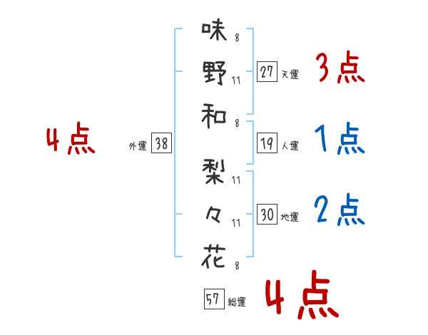総運![]() | 味野和梨々花さんの総運は57画の4つ星!向上心があり人望がある。地位を得る。 あなたの人生を表す1番重要な運勢です。生涯を通じて影響する総合運となり、主に50歳以降の晩年期に影響を及ぼします。 |