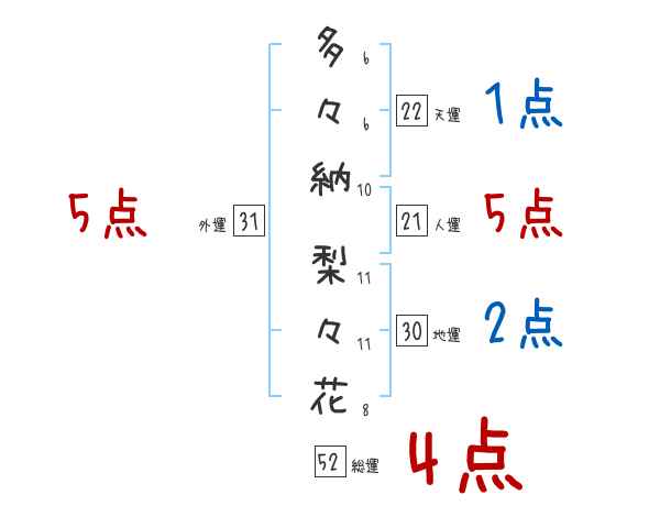 総運![]() | 多々納梨々花さんの総運は52画の4つ星!先見性と独創性に優れ考える力がある。強運の持ち主。 あなたの人生を表す1番重要な運勢です。生涯を通じて影響する総合運となり、主に50歳以降の晩年期に影響を及ぼします。 |