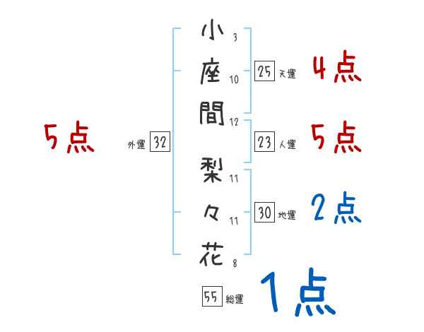 外運![]() | 小座間梨々花さんの外運は32画の5つ星!柔軟性があり成功する。チャンスが多く金運が良い。 生活面を象徴する運勢です。外部から受ける影響力を表し、結婚運、家庭運や職場、環境への順応性を表します。 |