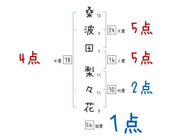 人運![]() | 桑波田梨々花さんの人運は16画の5つ星!人望が厚く大きく発展する。逆転成功が見える。 性格や才能などを表す2番目に重要な運勢です。人間関係や協調性、社会的な成功に影響します。主に20歳から50歳ぐらいまでの中年期の運勢を表します。 |