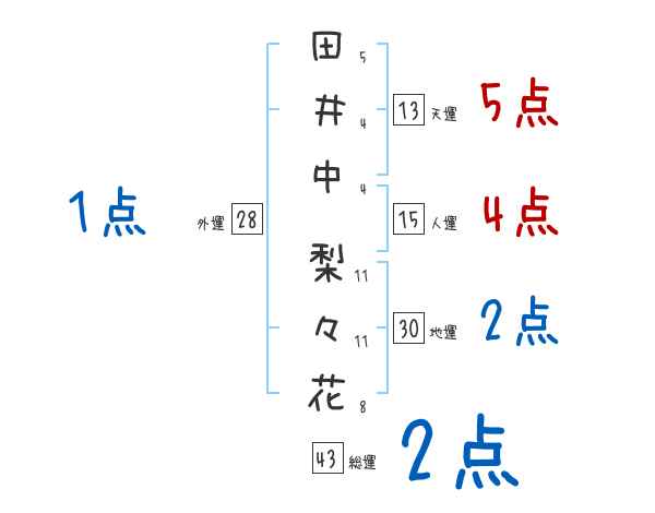 総運![]() | 田井中梨々花さんの総運は43画の2つ星!頑固な性格で独立心が強いかも。やや非現実的で浪費に注意しましょう。 あなたの人生を表す1番重要な運勢です。生涯を通じて影響する総合運となり、主に50歳以降の晩年期に影響を及ぼします。 |