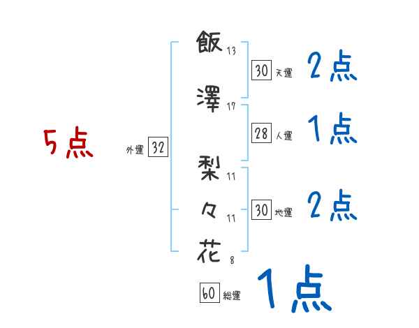 外運![]() | 飯澤梨々花さんの外運は32画の5つ星!柔軟性があり成功する。チャンスが多く金運が良い。 生活面を象徴する運勢です。外部から受ける影響力を表し、結婚運、家庭運や職場、環境への順応性を表します。 |