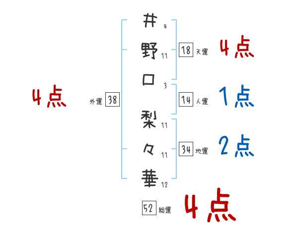 総運![]() | 井野口梨々華さんの総運は52画の4つ星!先見性と独創性に優れ考える力がある。強運の持ち主。 あなたの人生を表す1番重要な運勢です。生涯を通じて影響する総合運となり、主に50歳以降の晩年期に影響を及ぼします。 |