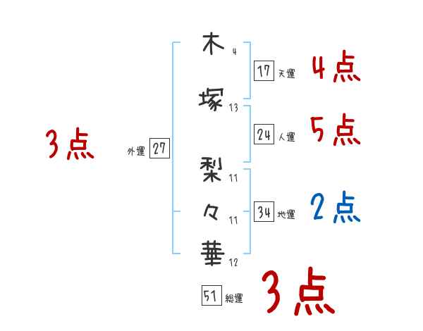 外運![]() | 木塚梨々華さんの外運は27画の3つ星!頭脳明晰だが強情で摩擦が多い傾向。孤立に注意。 生活面を象徴する運勢です。外部から受ける影響力を表し、結婚運、家庭運や職場、環境への順応性を表します。 |