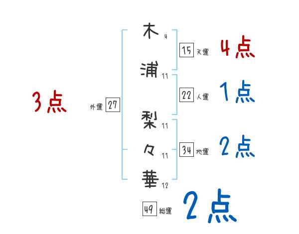 外運![]() | 木浦梨々華さんの外運は27画の3つ星!頭脳明晰だが強情で摩擦が多い傾向。孤立に注意。 生活面を象徴する運勢です。外部から受ける影響力を表し、結婚運、家庭運や職場、環境への順応性を表します。 |