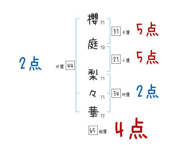 総運![]() | 櫻庭梨々華さんの総運は65画の4つ星!幸運に恵まれ繁栄する。包容力がある。 あなたの人生を表す1番重要な運勢です。生涯を通じて影響する総合運となり、主に50歳以降の晩年期に影響を及ぼします。 |