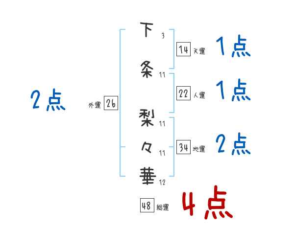 天運![]() | 下条梨々華さんの天運は14画の1つ星!人に対して優しいがストレスを溜め込みがち。人間関係のトラブルを避けるよう気をつけましょう。 家系が持つ宿命的な運勢を表します。祖先から受け継いだ苗字ですので自分の力が及びません。家柄を象徴します。 |