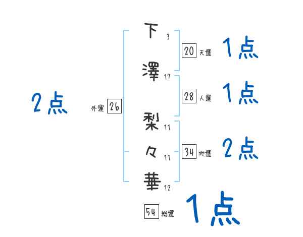 外運![]() | 下澤梨々華さんの外運は26画の2つ星!波瀾万丈かも。信頼できる人を大事にしましょう。 生活面を象徴する運勢です。外部から受ける影響力を表し、結婚運、家庭運や職場、環境への順応性を表します。 |