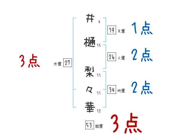 外運![]() | 井樋梨々華さんの外運は27画の3つ星!頭脳明晰だが強情で摩擦が多い傾向。孤立に注意。 生活面を象徴する運勢です。外部から受ける影響力を表し、結婚運、家庭運や職場、環境への順応性を表します。 |