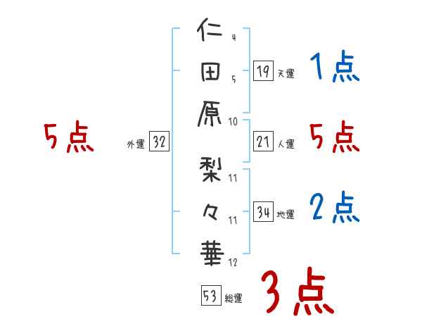 外運![]() | 仁田原梨々華さんの外運は32画の5つ星!柔軟性があり成功する。チャンスが多く金運が良い。 生活面を象徴する運勢です。外部から受ける影響力を表し、結婚運、家庭運や職場、環境への順応性を表します。 |