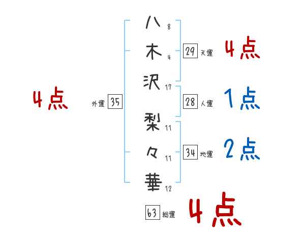 外運![]() | 八木沢梨々華さんの外運は35画の4つ星!温厚な性格で感受性が高い。穏和な性格で人望が厚い。 生活面を象徴する運勢です。外部から受ける影響力を表し、結婚運、家庭運や職場、環境への順応性を表します。 |