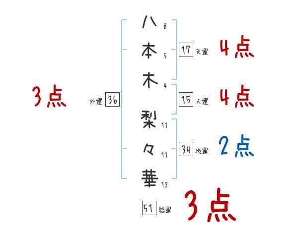 外運![]() | 八本木梨々華さんの外運は36画の3つ星!先見性が豊かです。多少神経質で苦労することも。 生活面を象徴する運勢です。外部から受ける影響力を表し、結婚運、家庭運や職場、環境への順応性を表します。 |