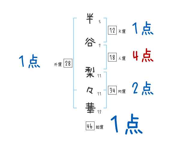 天運![]() | 半谷梨々華さんの天運は12画の1つ星!簡単な失敗で諦めてしまいやすいかも。着実に行動すると良いでしょう。 家系が持つ宿命的な運勢を表します。祖先から受け継いだ苗字ですので自分の力が及びません。家柄を象徴します。 |