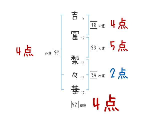 外運![]() | 吉冨梨々華さんの外運は29画の4つ星!完全主義で才能がある。厳格な心の持ち主。 生活面を象徴する運勢です。外部から受ける影響力を表し、結婚運、家庭運や職場、環境への順応性を表します。 |