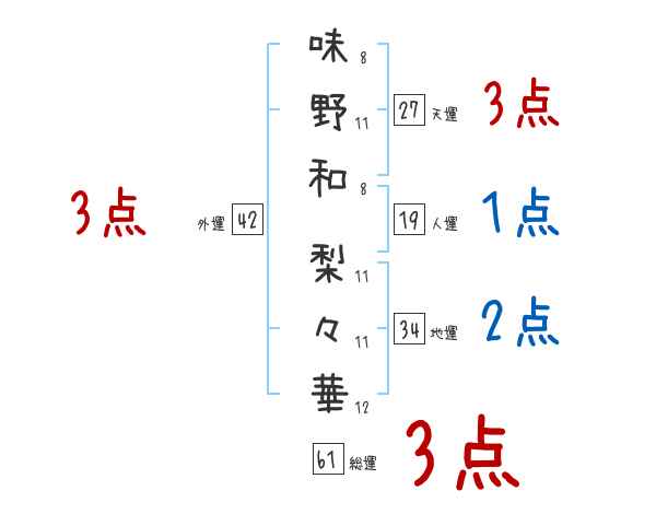総運![]() | 味野和梨々華さんの総運は61画の3つ星!強情な性格でうぬぼれタイプ。自ら破滅する。 あなたの人生を表す1番重要な運勢です。生涯を通じて影響する総合運となり、主に50歳以降の晩年期に影響を及ぼします。 |