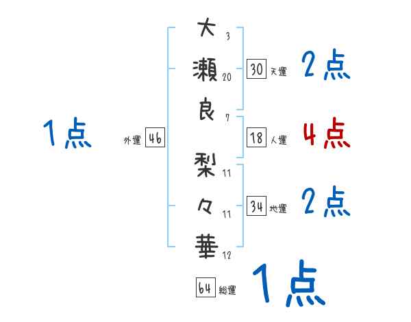外運![]() | 大瀬良梨々華さんの外運は46画の1つ星!迷走することが多く苦労するかも。目先のことにとらわれないように。 生活面を象徴する運勢です。外部から受ける影響力を表し、結婚運、家庭運や職場、環境への順応性を表します。 |