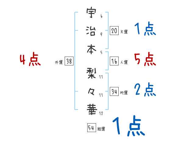 総運![]() | 宇治本梨々華さんの総運は54画の1つ星!トラブルが多いかも。周りをよく見て協調して過ごしましょう。 あなたの人生を表す1番重要な運勢です。生涯を通じて影響する総合運となり、主に50歳以降の晩年期に影響を及ぼします。 |