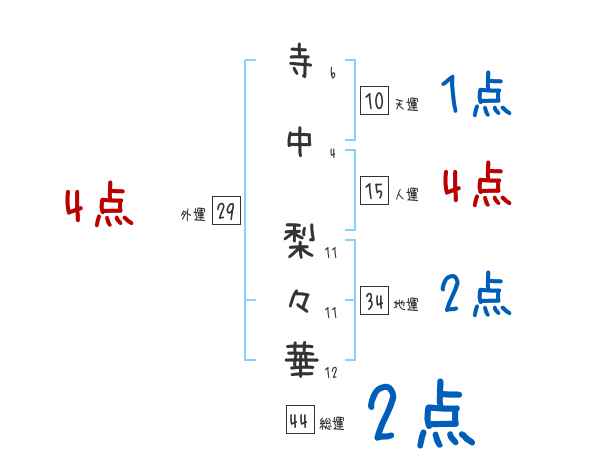 総運![]() | 寺中梨々華さんの総運は44画の2つ星!誠実で慎重な性格。物事を考えすぎないように注意しましょう。 あなたの人生を表す1番重要な運勢です。生涯を通じて影響する総合運となり、主に50歳以降の晩年期に影響を及ぼします。 |