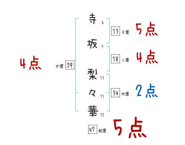 総運![]() | 寺坂梨々華さんの総運は47画の5つ星!実力が開花し発展する円満な人生。財に恵まれる。 あなたの人生を表す1番重要な運勢です。生涯を通じて影響する総合運となり、主に50歳以降の晩年期に影響を及ぼします。 |